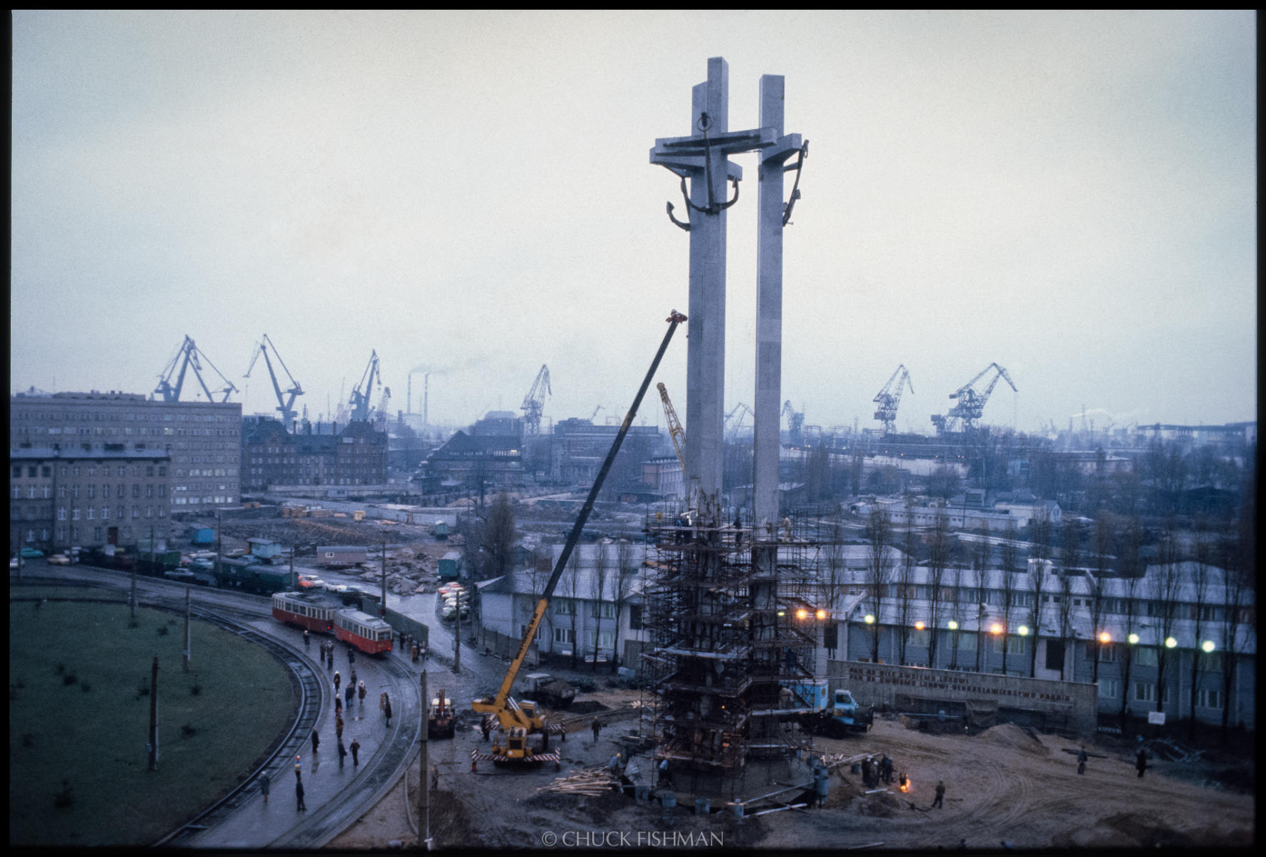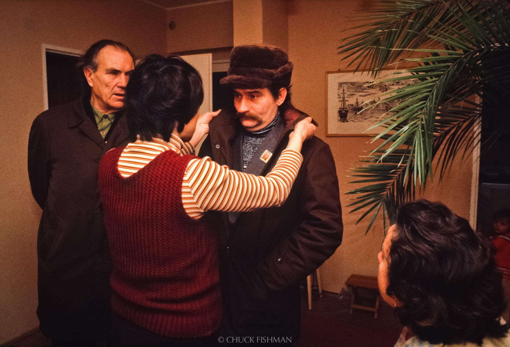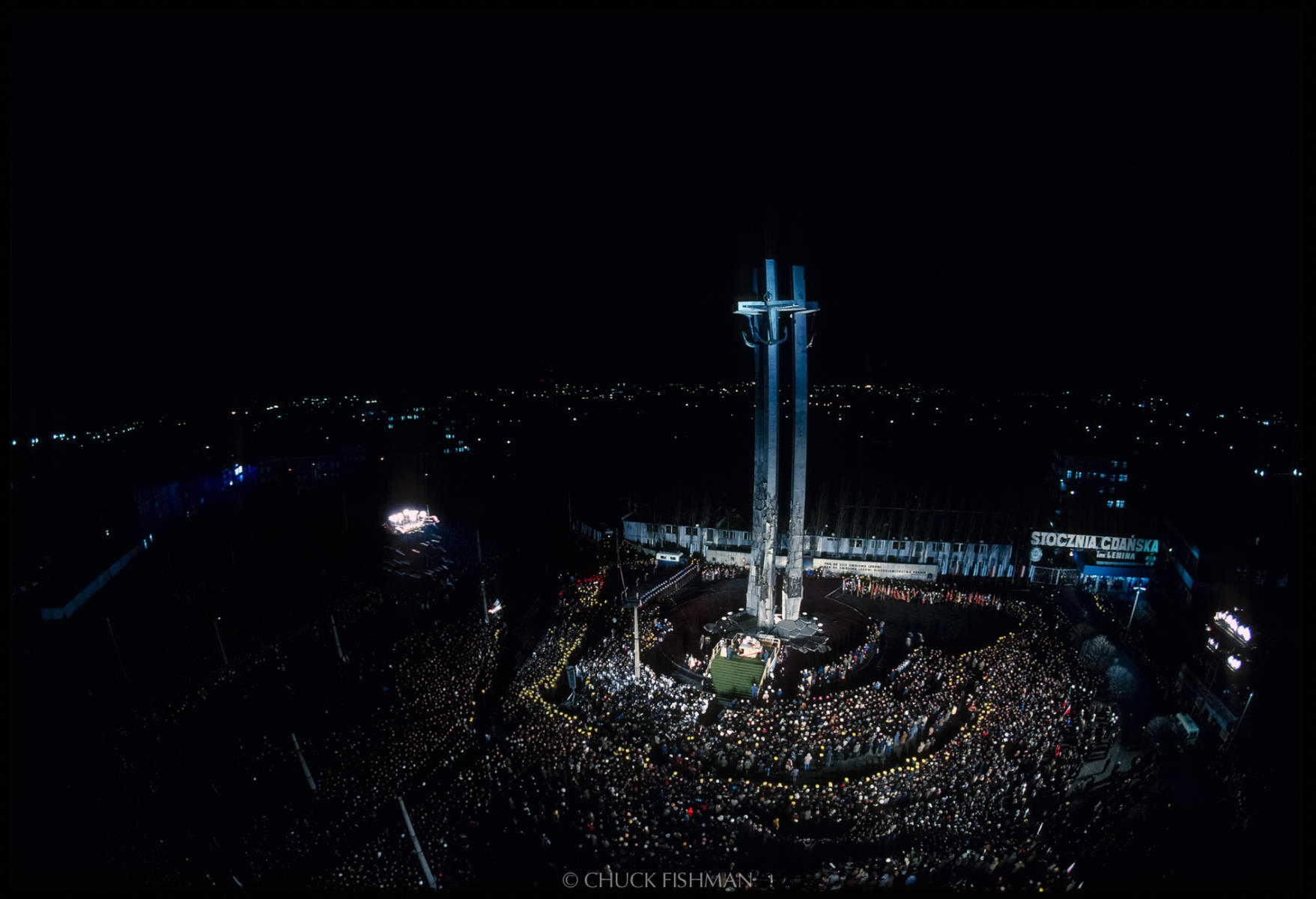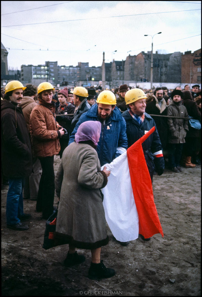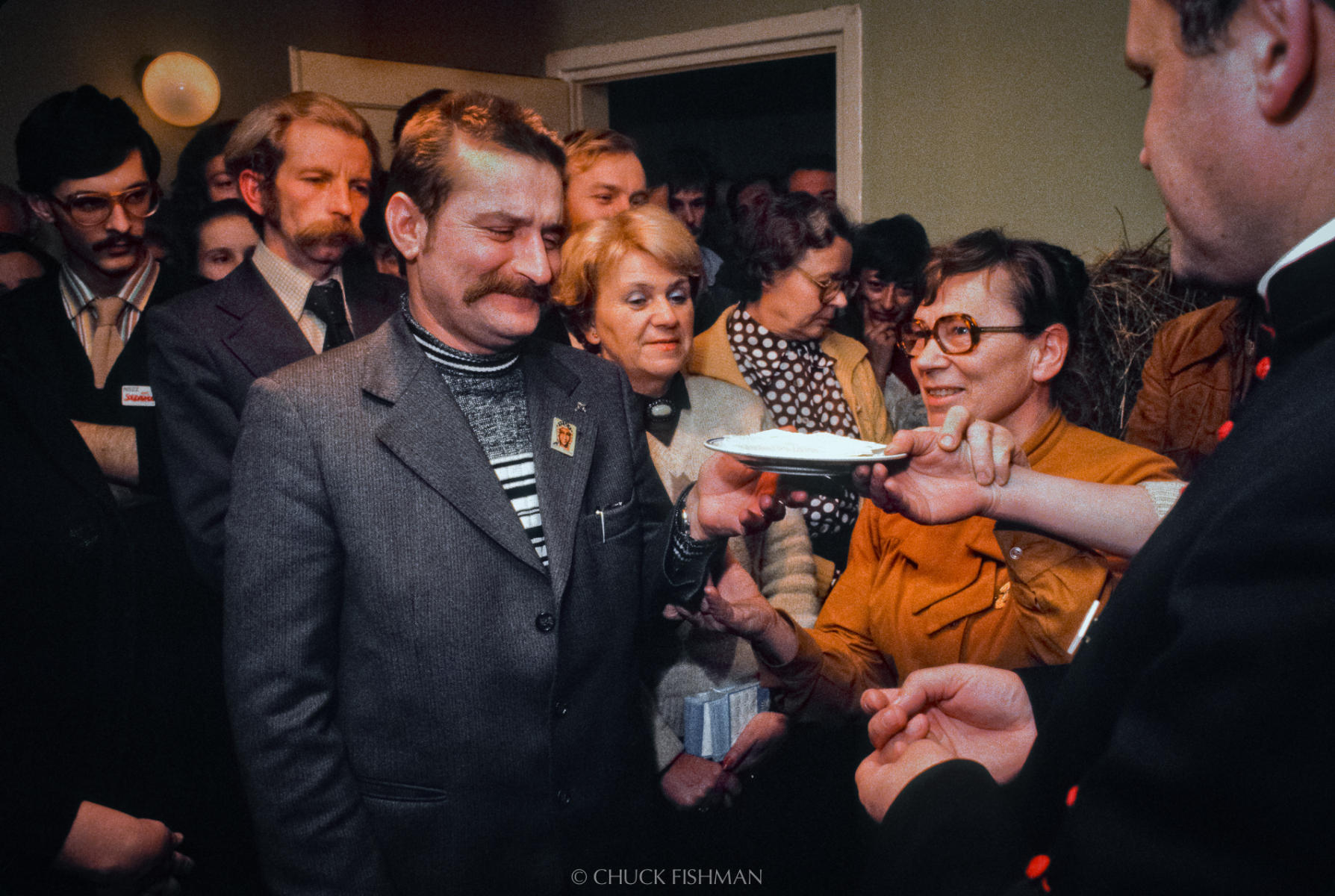 To meet and photograph Lech Walesa—this was my entire purpose for getting into Poland in 1980. I believed him to be the “man of the year”, a major historical figure, and I wanted to get to know and spend time with him if at all possible. (In fact, a year later Time magazine put Walesa on their cover as Time’s “Man of the Year”.) I informed both my agency in New York, Contact Press Images, and Time magazine that I was going to Poland to photograph Lech Walesa. I had laid out a plan and it became a self-fulfilling prophecy. Time magazine accordingly informed people working for them in Poland that Fishman was going to be photographing Walesa, so they thought that I was “assigned” by Time, which immediately gave me credibility. Contact Press sent me b&w prints of pictures I had made of Walesa’s step-father a few months earlier at his home in New Jersey. Arriving in Warsaw I made my way up to Gdansk, and via French photographer, Arnaud de Wildenberg, I was introduced to a Solidarity interpreter at Solidarity headquarters. She spoke French better than English but enough to translate to Polish. With others milling about, we waited together in the outer room of Walesa’s office. It was very late afternoon when Walesa came out and everyone wanted time with him. Continuously standing amidst so many in the crowded space, the translator and I met with him there. She told him who I was and that I would be in Gdansk for the week. He was receptive. I offered him the pictures of his step-father which he very much appreciated. When he saw one with a woman in it and asked who she was, I told the translator it was his girlfriend. He liked that and laughed. We established a rapport. That’s when I told the interpreter to ask if I could go to church with him early the next morning. He replied “oczywicie!” (of course!). I was given his home address. We would go together.