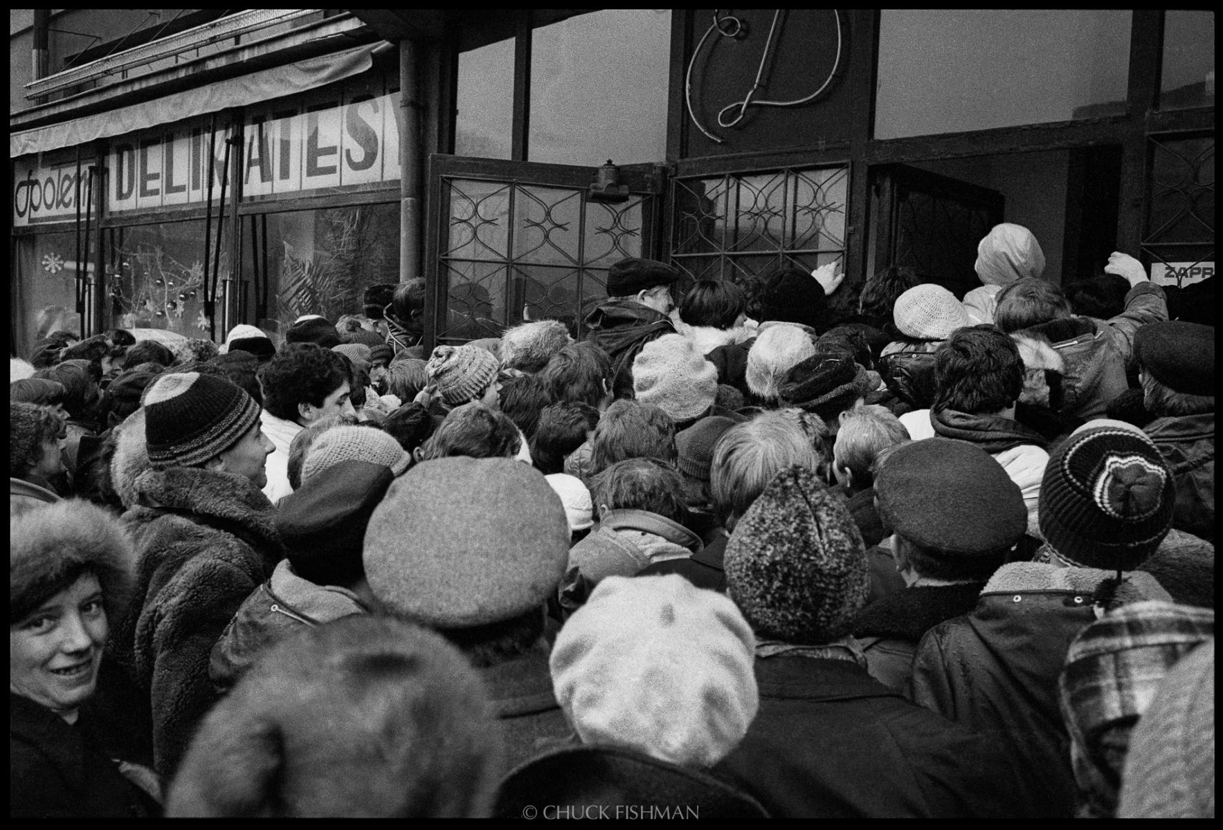 There was little difference in the few days that I was gone — except that Leszek had gotten a haircut. Otherwise I still had the access he afforded me and was able to photograph events like the traditional Christmas offering and breaking of bread followed by kissing (oplatek) in his private office with his staff. I also photographed activities within Solidarity headquarters and life on the streets of Gdansk which included long lines of people waiting to purchase food. One undertaking I photographed in the headquarters “art department” was the making of Solidarity T-shirts. I still have mine and wear it on special occasions…. even if it now seems to be a little tight.